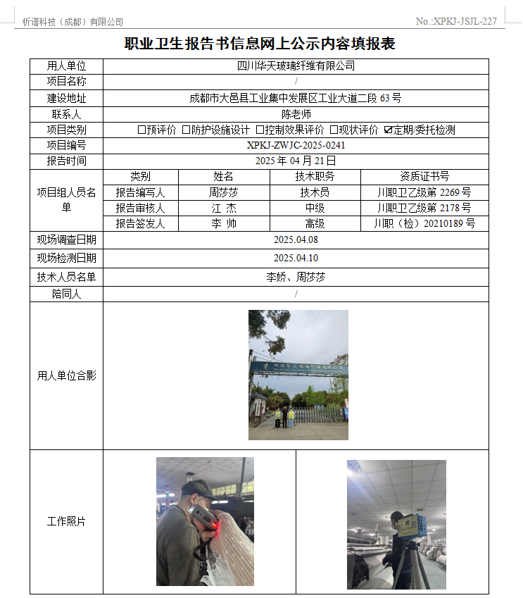 四川华天玻璃纤维有限公司职业病危害因素定期检测
