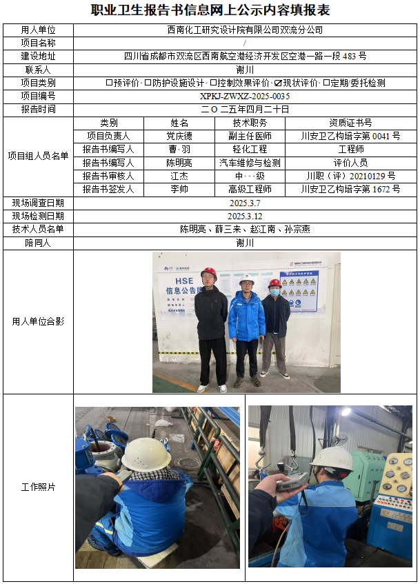 西南化工研究设计院有限公司双流分公司职业病危害因素现状评价