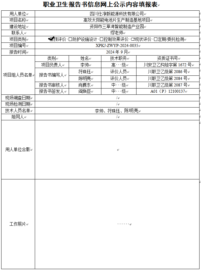 四川仕净新能源科技有限公司职业病危害因素预评价