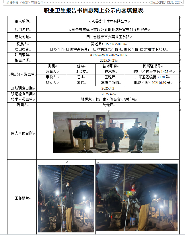 大英县宏丰建材有限公司职业病危害因素定期检测