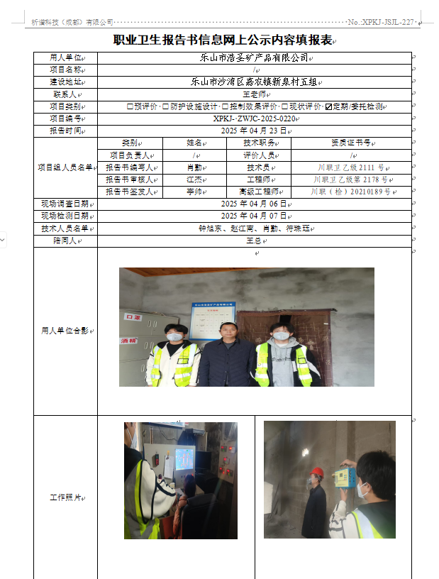 乐山市浩圣矿产品有限公司职业病危害因素定期检测