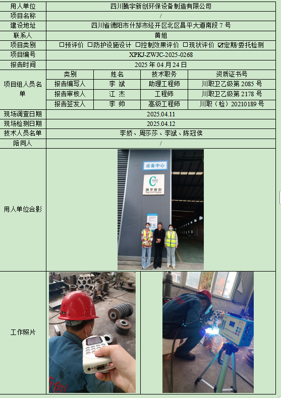 四川腾宇新创环保设备制造有限公司职业病危害因素定期检测