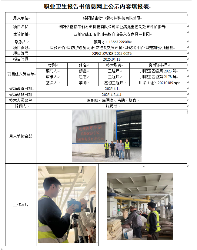绵阳格雷特尔新材料科技有限公司职业病危害因素控制效果评价