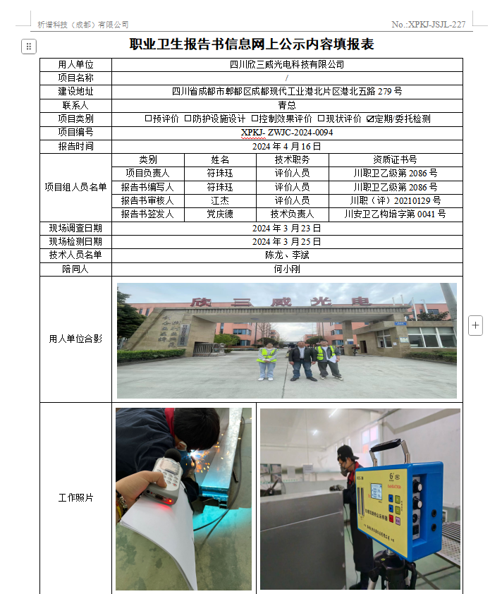 四川欣三威光电科技有限公司职业病危害因素定期检测