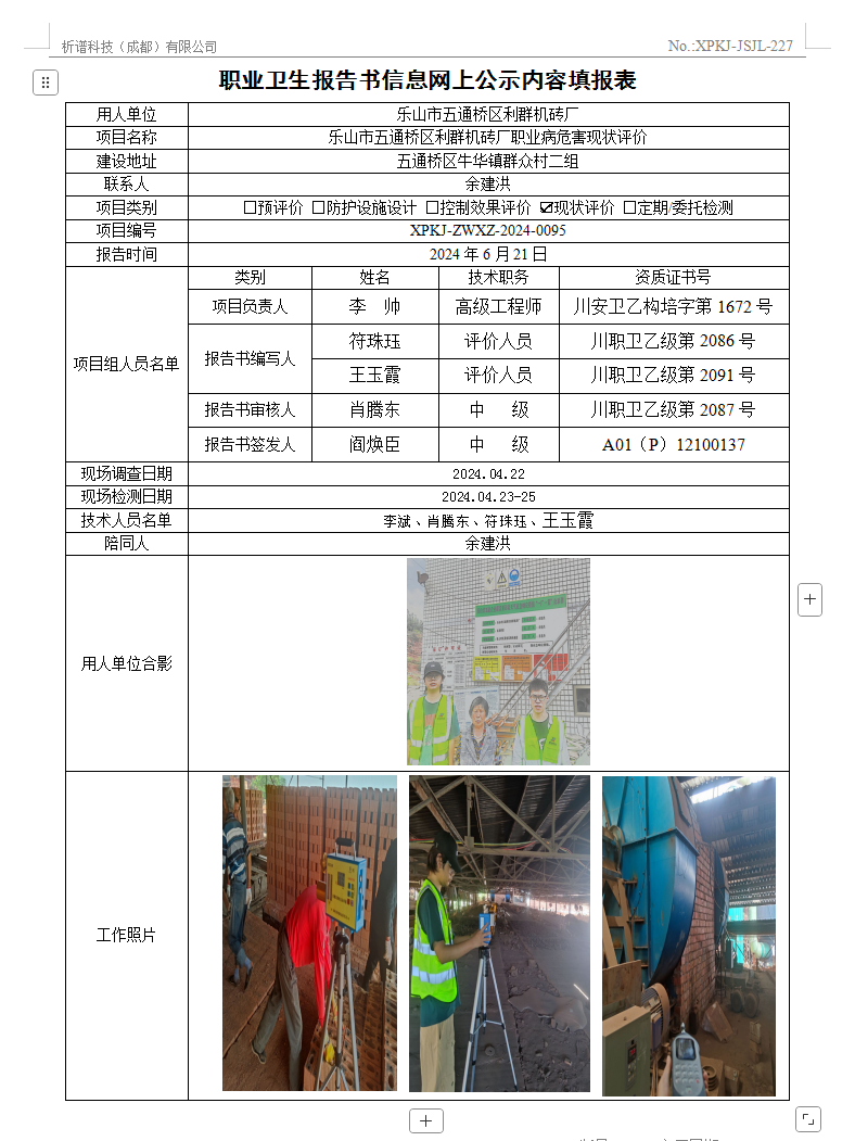 乐山市五通桥区利群机砖厂职业病危害现状评价