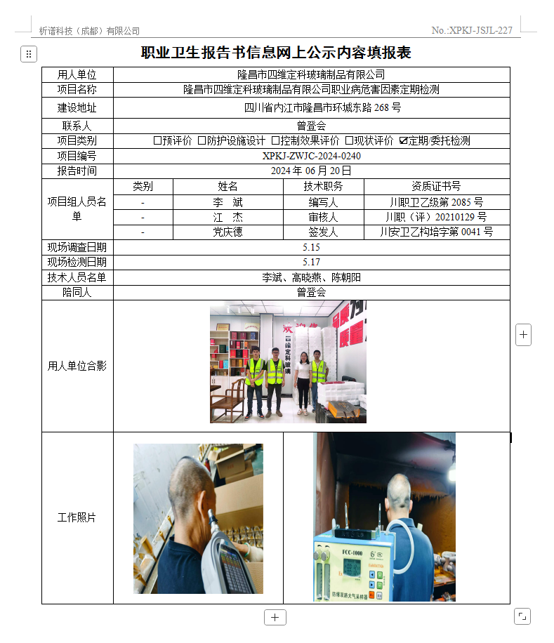 隆昌市四维定科玻璃制品有限公司职业病危害因素定期检测
