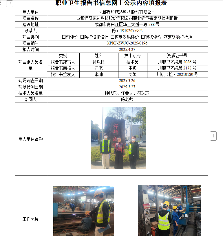 成都焊研威达科技股份有限公司职业病危害因素定期检测