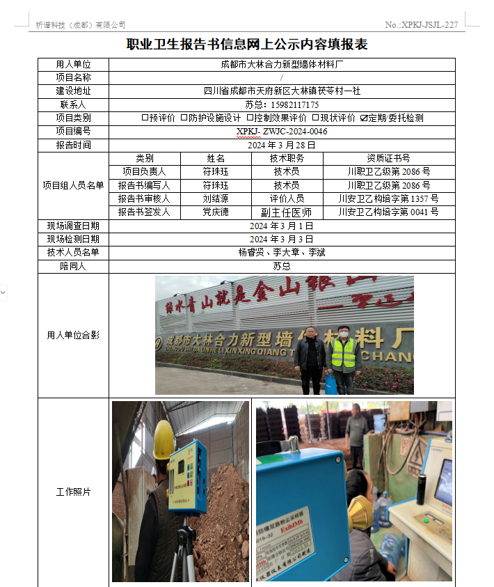 成都市大林合力新型墙体材料厂职业病危害因素定期检测