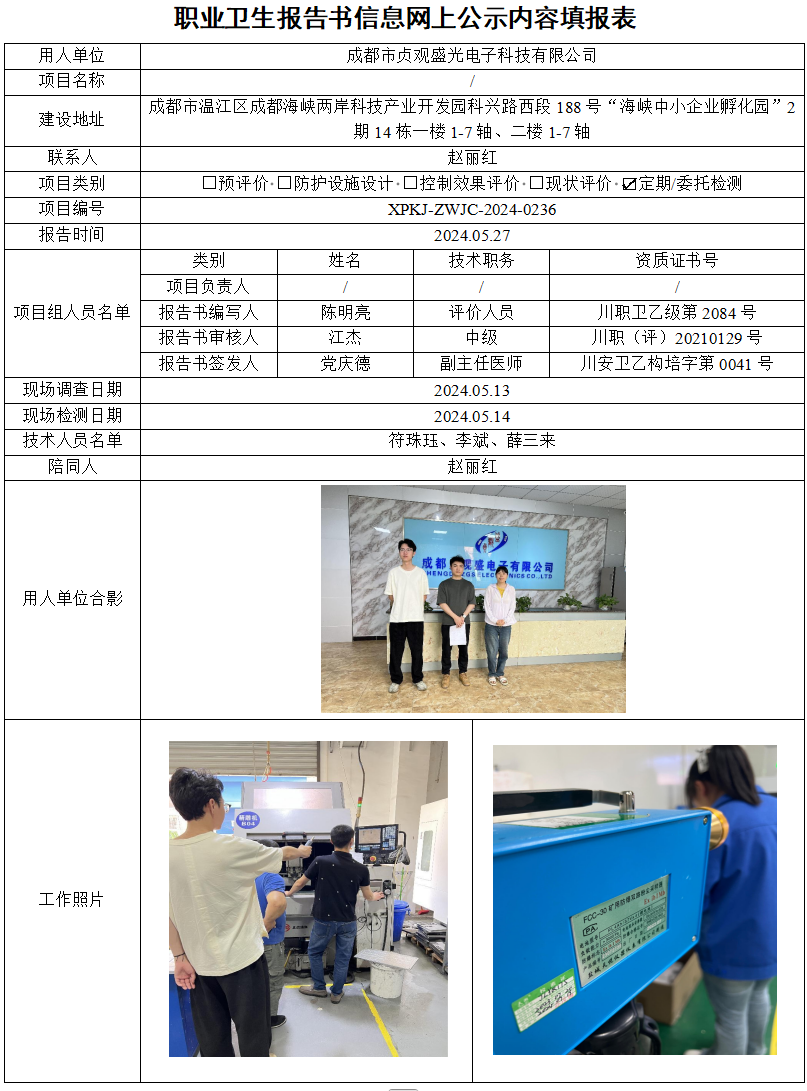 成都市贞观盛光电子科技有限公司职业病危害因素定期检测
