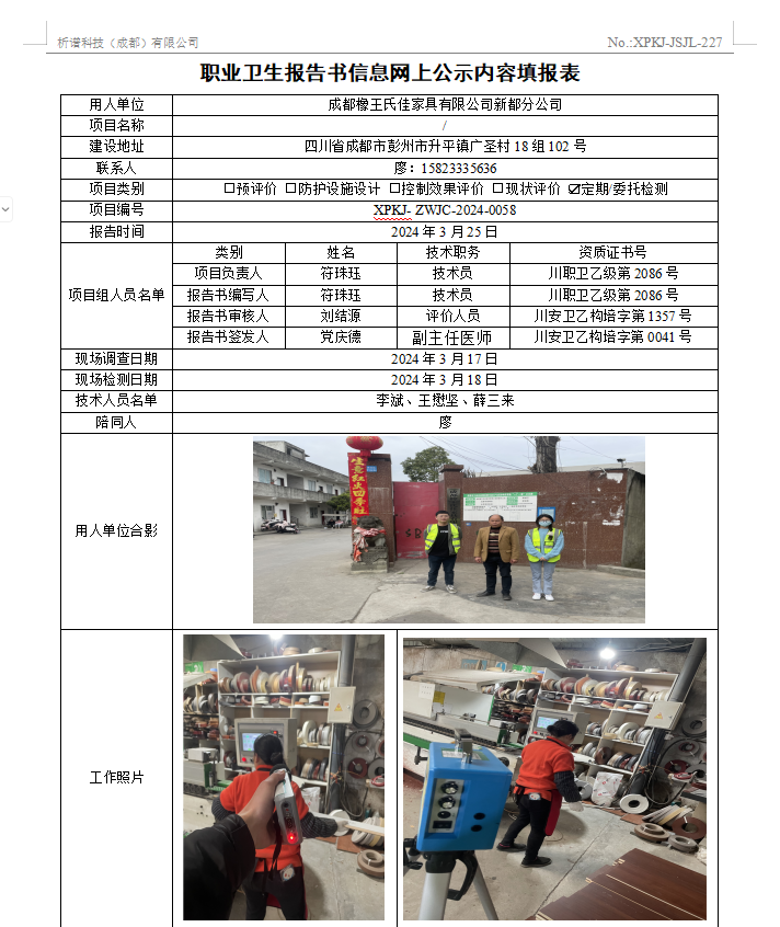 成都橡王氏佳家具有限公司新都分公司职业病危害因素定期检测