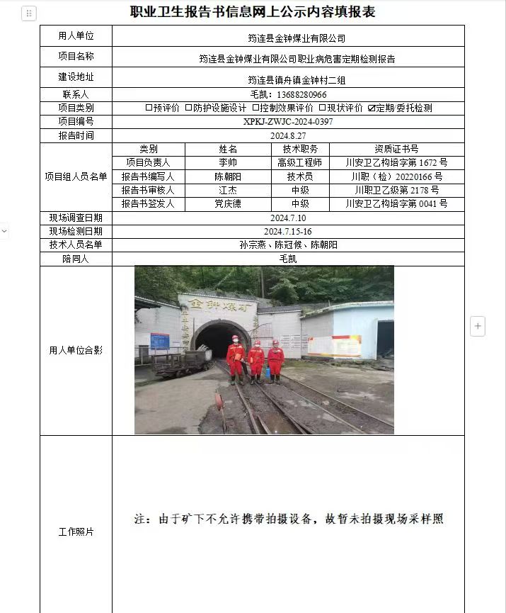 筠连县金钟煤业有限公司职业病危害因素定期检测
