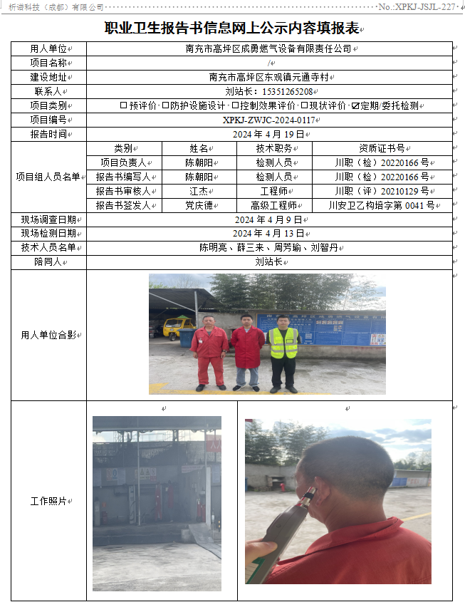 南充市高坪区成勇燃气设备有限责任公司职业病危害因素定期检测