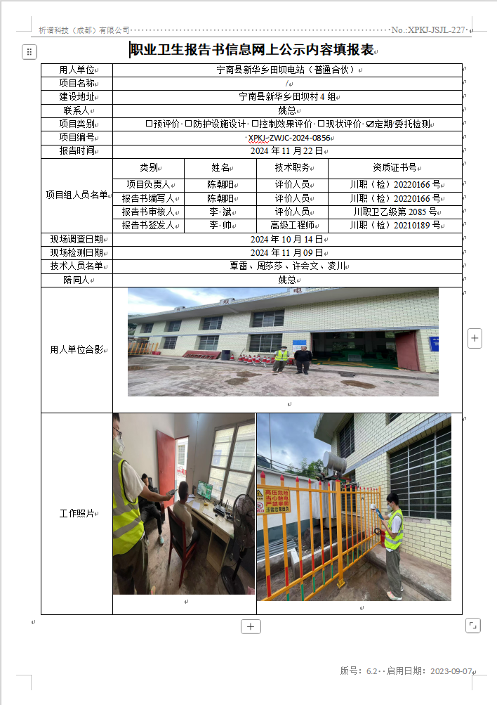 宁南县新华乡田坝电站(普通合伙)职业病危害因素定期检测