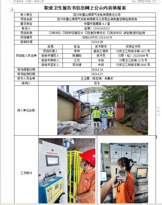 四川华蓥山煤层气发电有限责任公司职业病危害因素定期检测