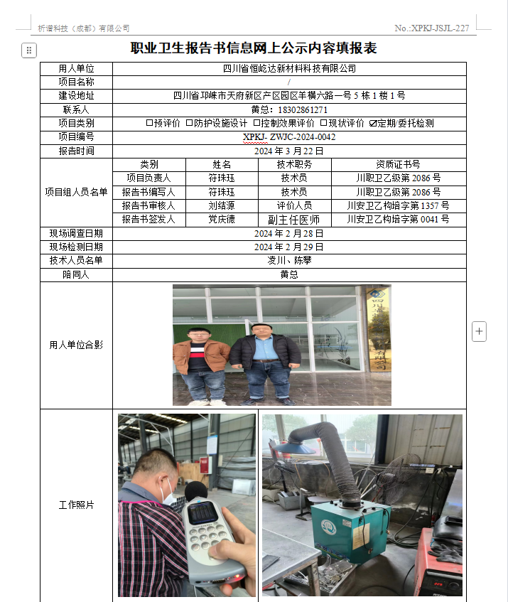 四川省恒屹达新材料科技有限公司职业病危害因素定期检测