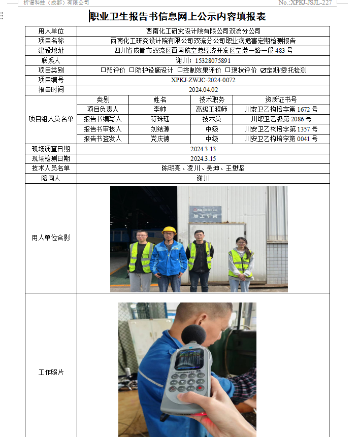 西南化工研究设计院有限公司双流分公司职业病危害因素定期检测
