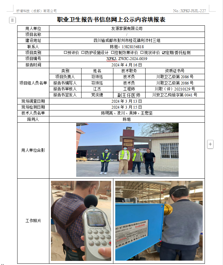 友源家具有限公司职业病危害因素定期检测