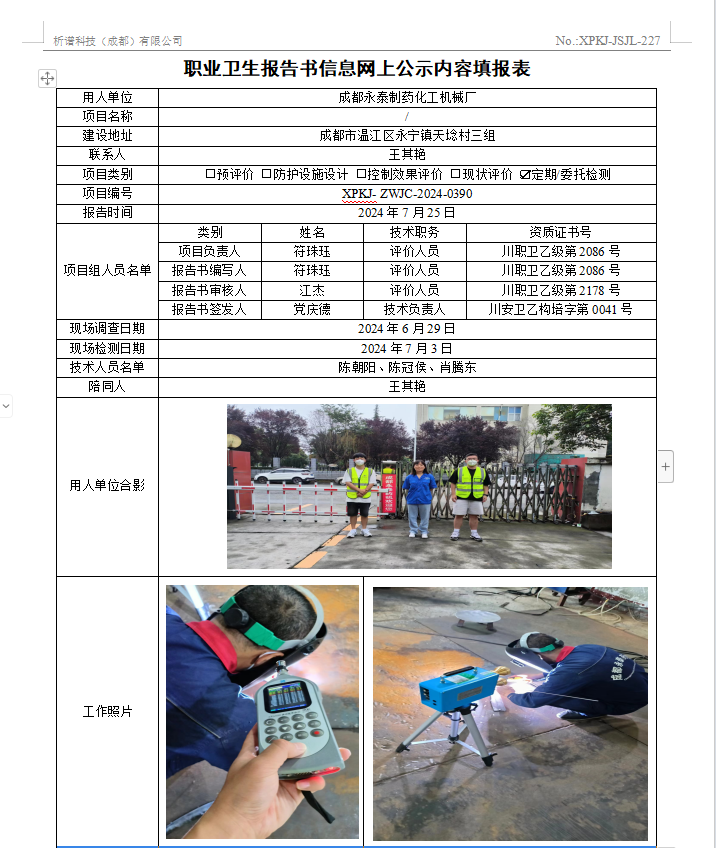 成都永泰制药化工机械厂职业病危害因素定期检测