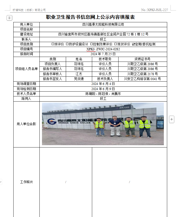 四川高景太阳能科技有限公司职业病危害因素定期检测