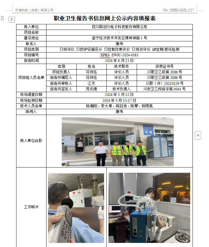 四川英创力电子科技股份有限公司职业病危害因素定期检测
