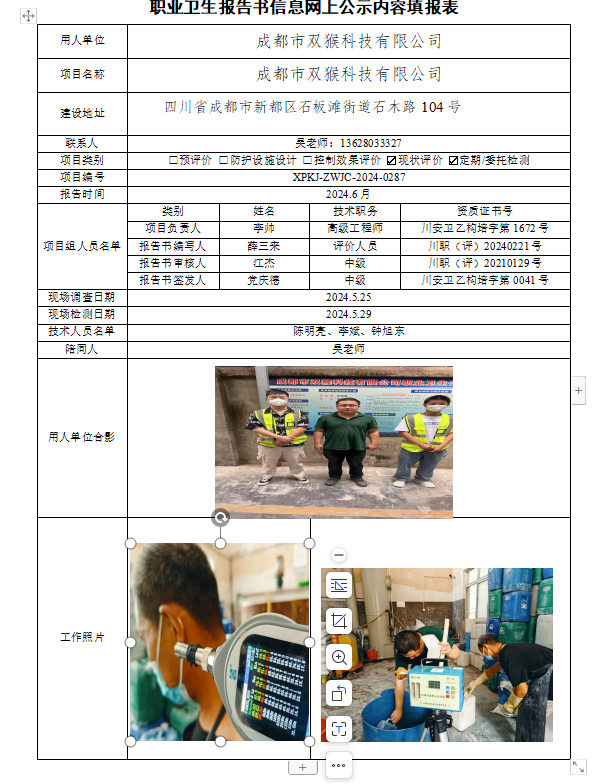 成都市双猴科技有限公司职业病危害因素定期检测