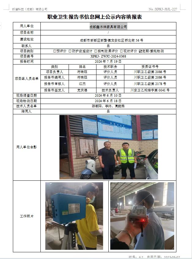 成都鑫木祥家具有限公司职业病危害因素定期检测