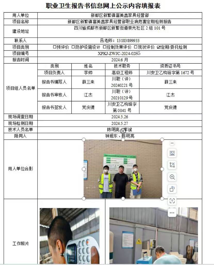 新都区新繁镇富美鑫家具经营部职业病危害因素定期检测