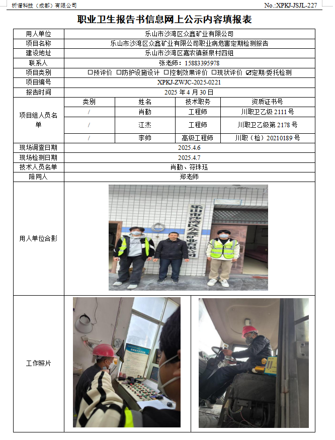 乐山市沙湾区众鑫矿业有限公司职业病危害因素定期检测