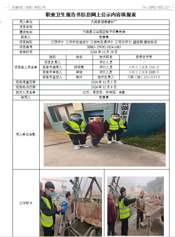 大英县强泰建材厂职业病危害因素定期检测