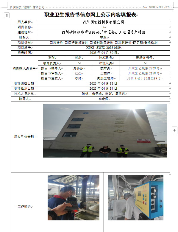 四川朗迪新材料有限公司职业病危害因素定期检测