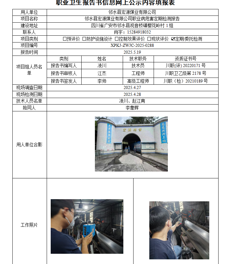 邻水县宏源煤业有限公司职业病危害因素定期检测