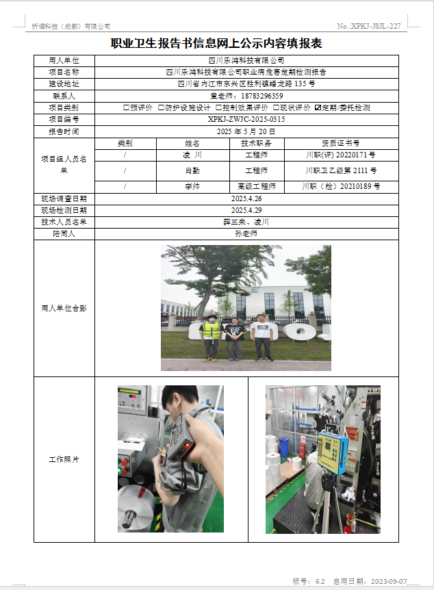 四川乐鸿科技有限公司职业病危害因素定期检测