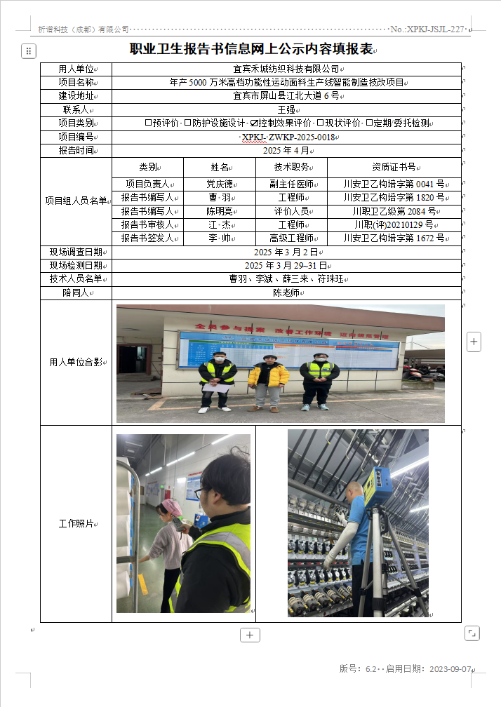 宜宾禾城纺织科技有限公司职业病危害因素控制效果评价