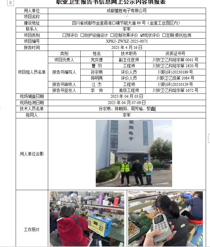 四川欣三威光电科技有限公司职业病危害因素定期检测