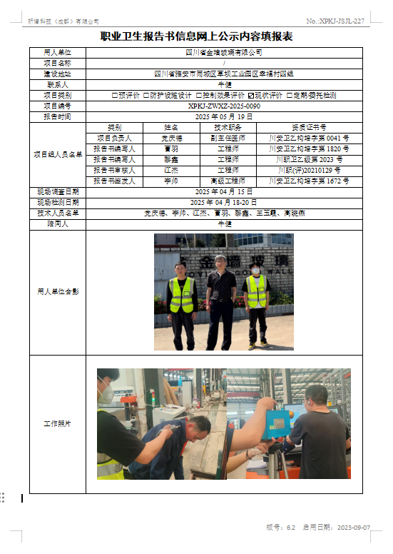 四川省金墙玻璃有限公司职业病危害因素现状评价