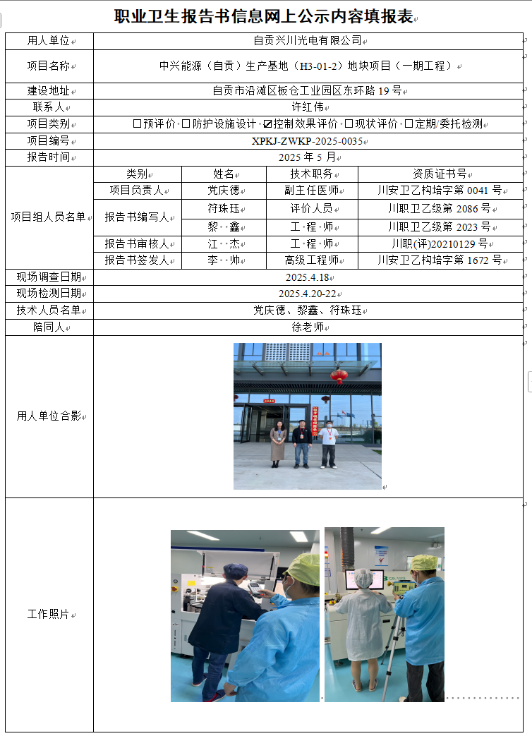 自贡兴川光电有限公司中兴能源(自贡)生产基地(H3-01-2)地块项目(二期工程)职业病危害因素控制效果评价