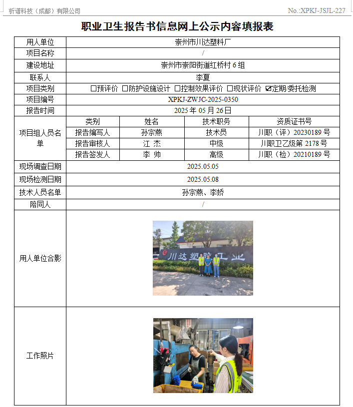 崇州市川达塑料厂职业病危害因素定期检测