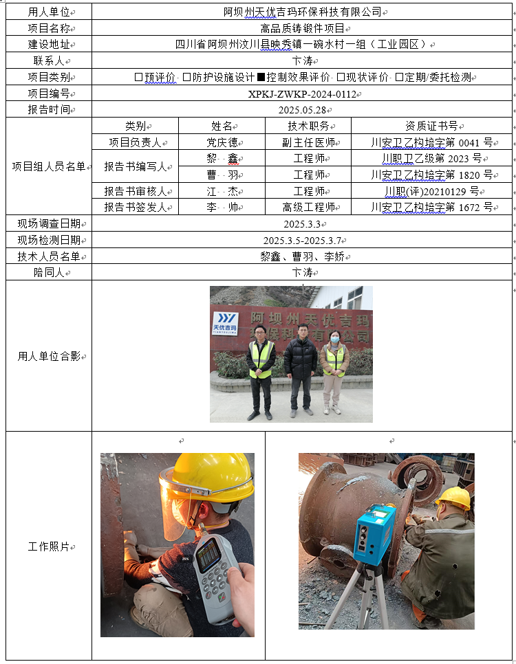 阿坝州天优吉玛环保科技有限公司职业病危害因素控制效果评价