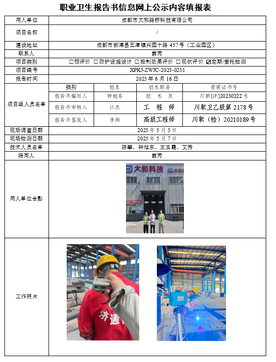 成都市大和路桥科技有限公司职业病危害因素定期检测