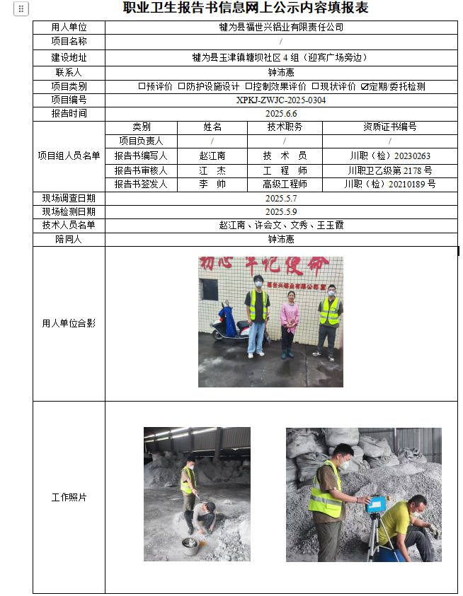 犍为县福世兴铝业有限责任公司职业病危害因素定期检测