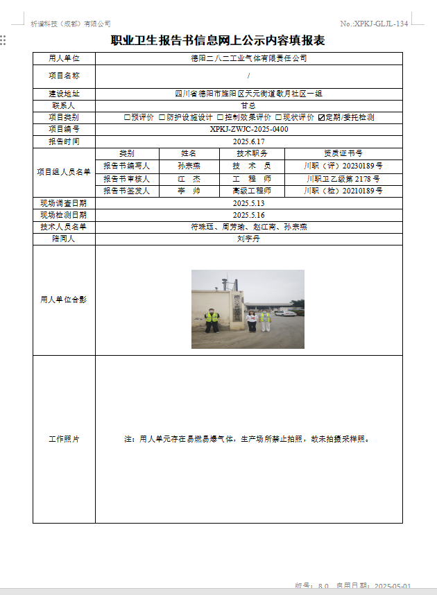 德阳二八二工业气体有限责任公司职业病危害因素定期检测