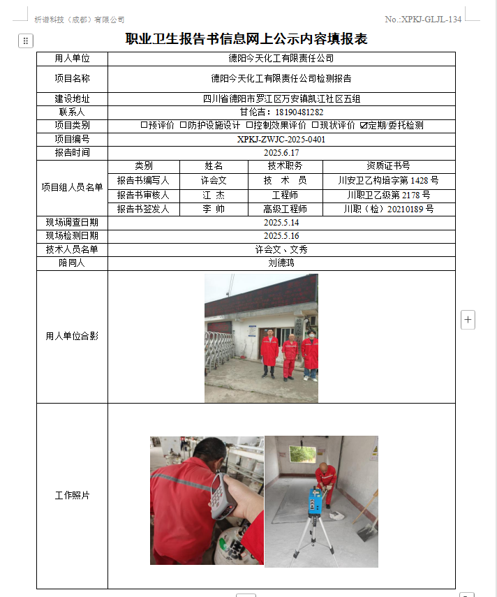 德阳今天化工有限责任公司职业病危害因素定期检测