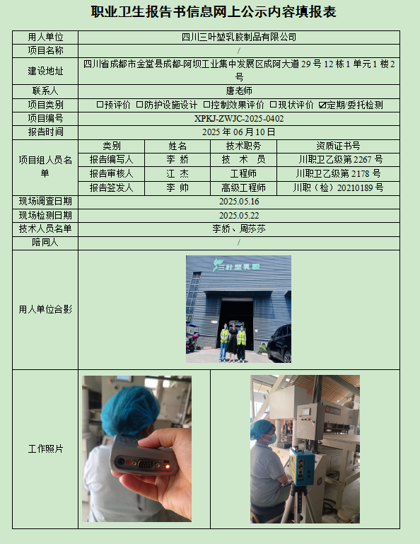 四川三叶堃乳胶制品有限公司职业病危害因素定期检测