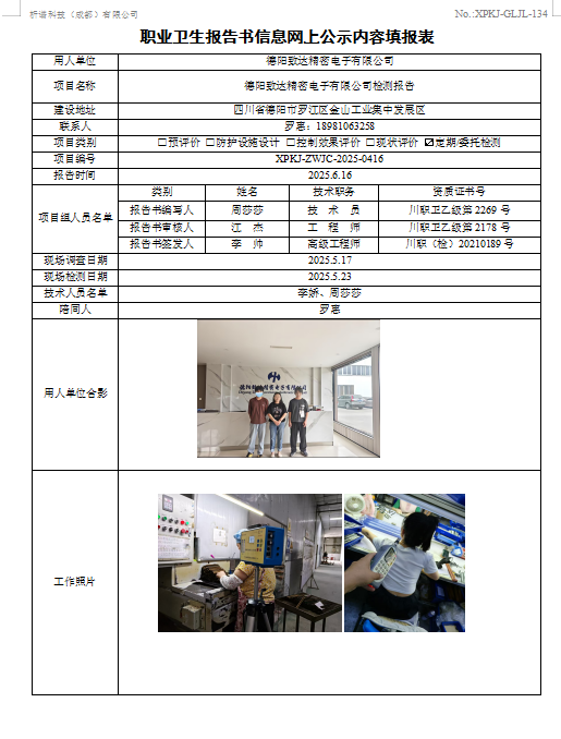 德阳致达精密电子有限公司职业病危害因素定期检测