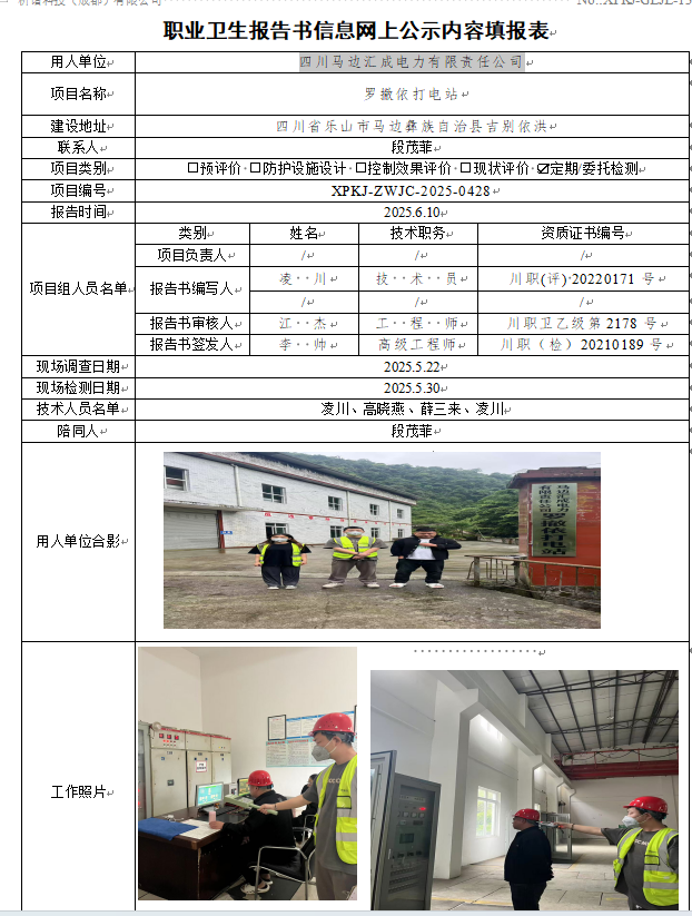 马边汇成电力有限责任公司职业病危害因素定期检测