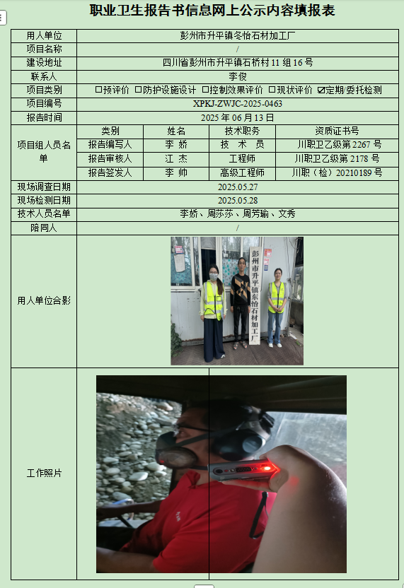 彭州市升平镇冬怡石材加工厂职业病危害因素定期检测