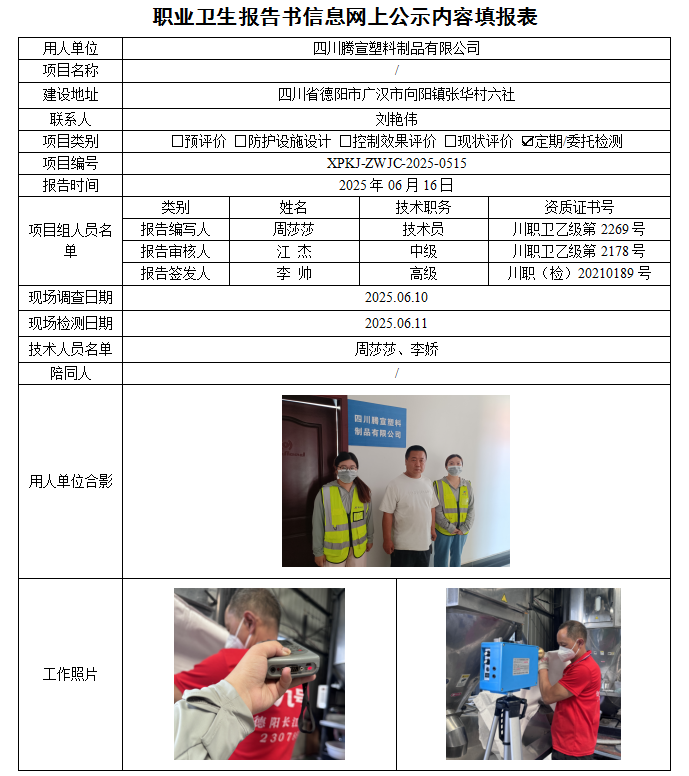 四川腾宣塑料制品有限公司职业病危害因素定期检测