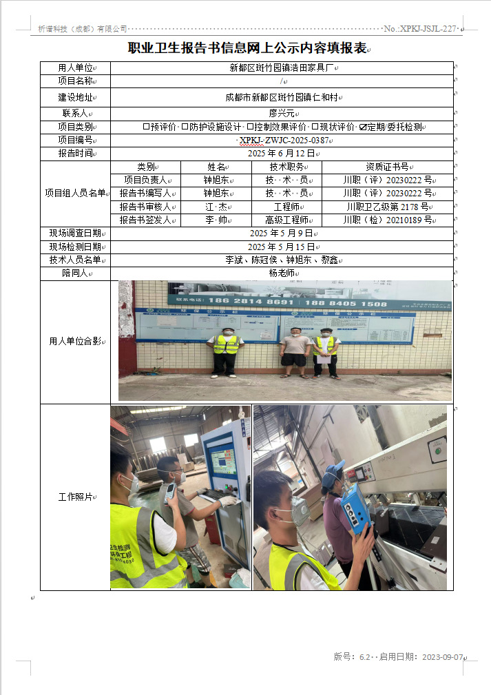 新都区斑竹园镇浩田家具厂职业病危害因素定期检测