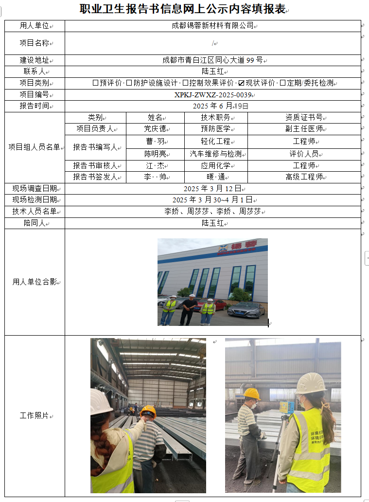 成都锡蓉新材料有限公司职业病危害因素现状评价