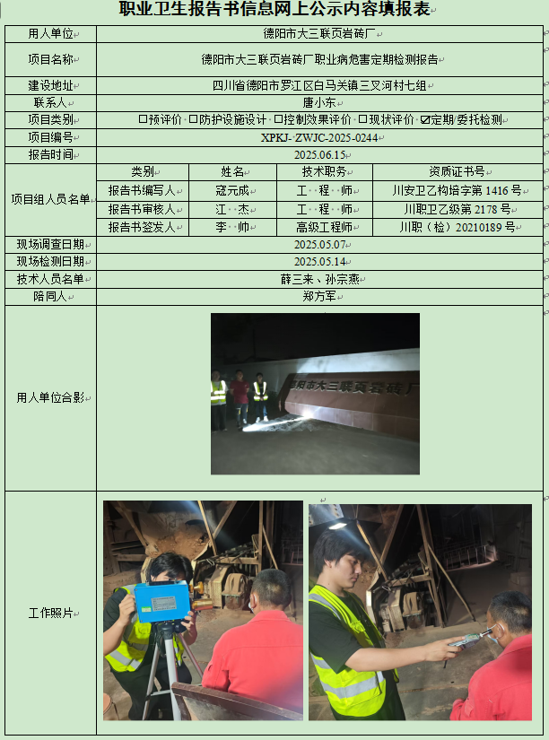 德阳市大三联岩业砖厂职业病危害因素定期检测